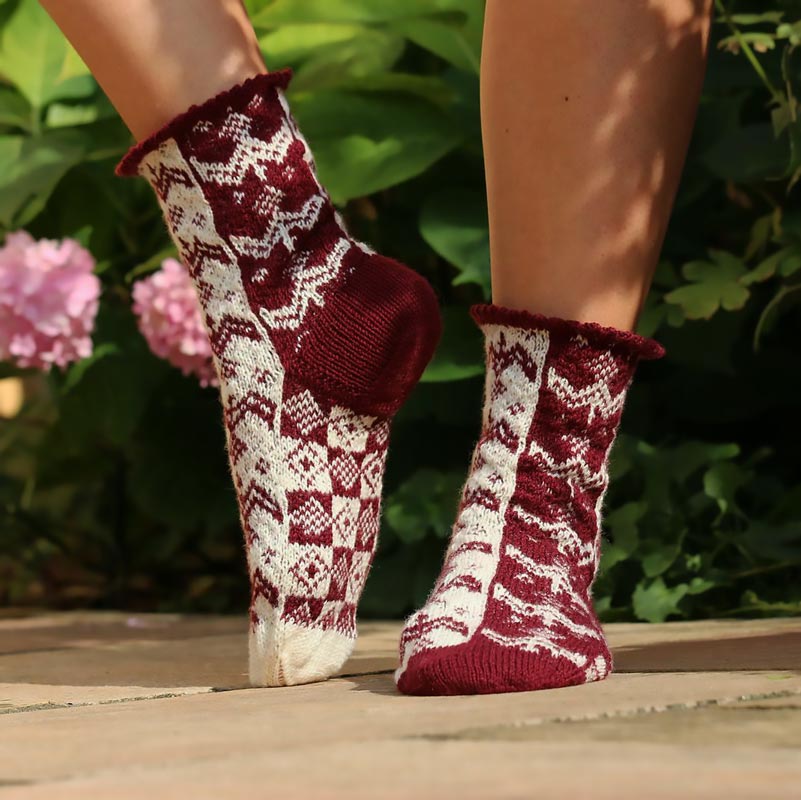 These Nordic-inspired socks are to die for! Don't they remind you of the beautiful time of Christmas? This advanced-level project uses fingering weight yarn to create a gorgeous traditional embroidery pattern. It uses contrasting colors, such as black and white, and incorporates a few knitting techniques, such as stranded colorwork, jacquard, and many more.