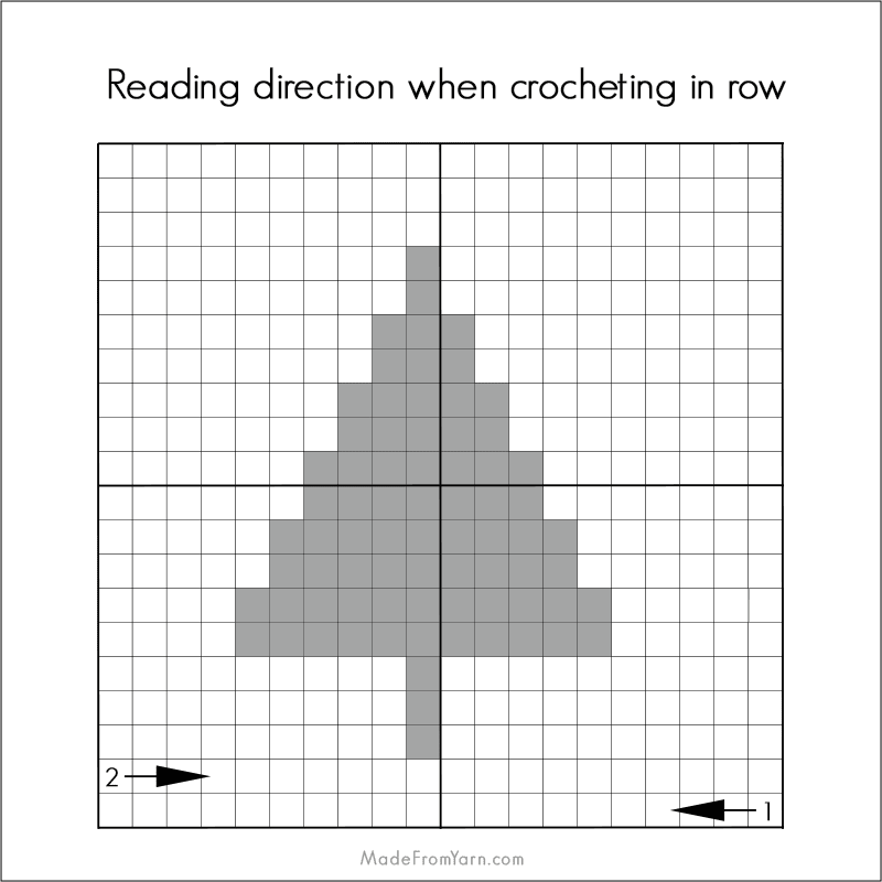 When working in rounds, read the pattern from the bottom of the grid and move upwards. Because you are crocheting in a circular motion without turning your crochet work, always read the pattern from right to left. As you crochet, refer to the grid pattern to see which color to use for the next stitch.