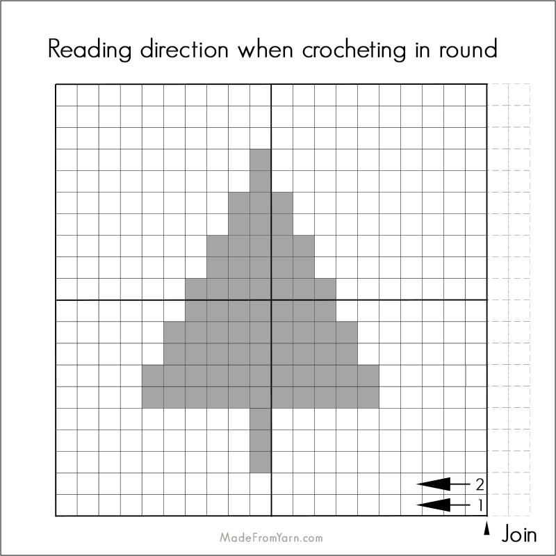 When working in rounds, read the pattern from the bottom of the grid and move upwards. Because you are crocheting in a circular motion without turning your crochet work, always read the pattern from right to left. As you crochet, refer to the grid pattern to see which color to use for the next stitch.