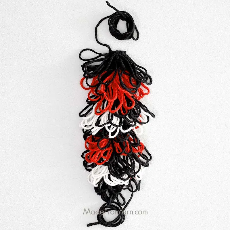 - Make 2 starting with Black yarn, and make a Magic Ring (MR):