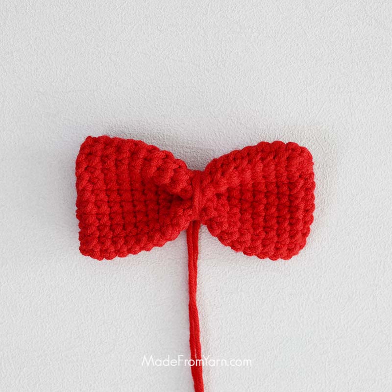 - Wrap yarn around the middle tightly to form a bow. Leave a long tail at the back for sewing.